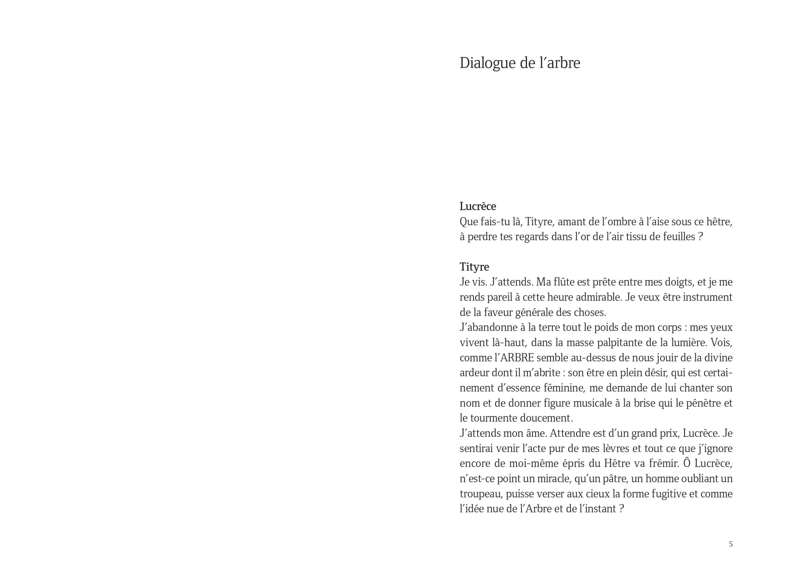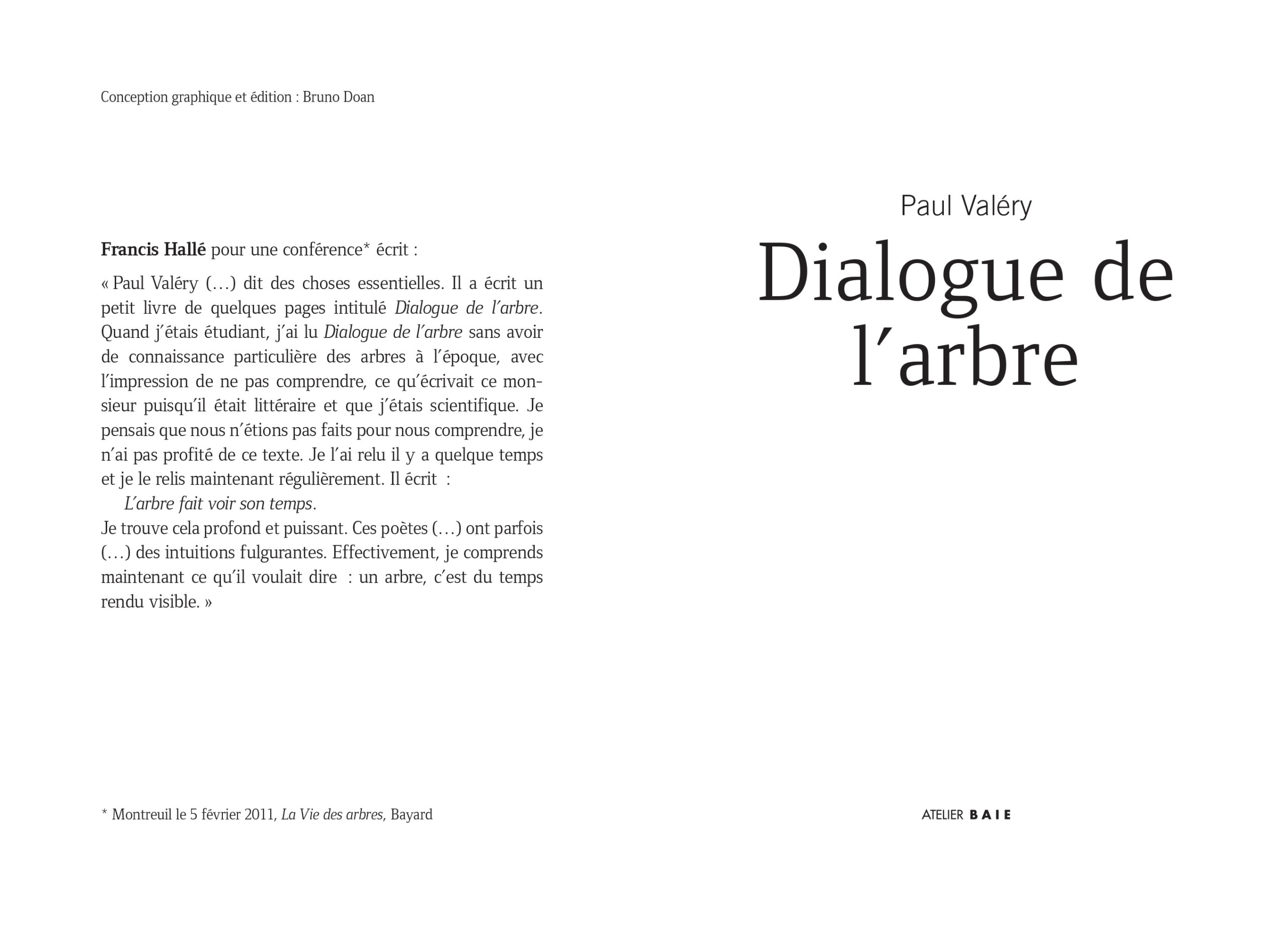 « Paul Valéry (…) dit des choses essentielles. Il a écrit un petit livre de quelques pages intitulé Dialogue de l’arbre. Quand j’étais étudiant, j’ai lu Dialogue de l’arbre sans avoir de connaissance particulière des arbres à l’époque, avec l’impression de ne pas comprendre, ce qu’écrivait ce monsieur puisqu’il était littéraire et que j’étais scientifique. Je pensais que nous n’étions pas faits pour nous comprendre, je n’ai pas profité de ce texte. Je l’ai relu il y a quelque temps et je le relis maintenant régulièrement.